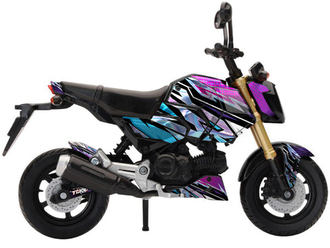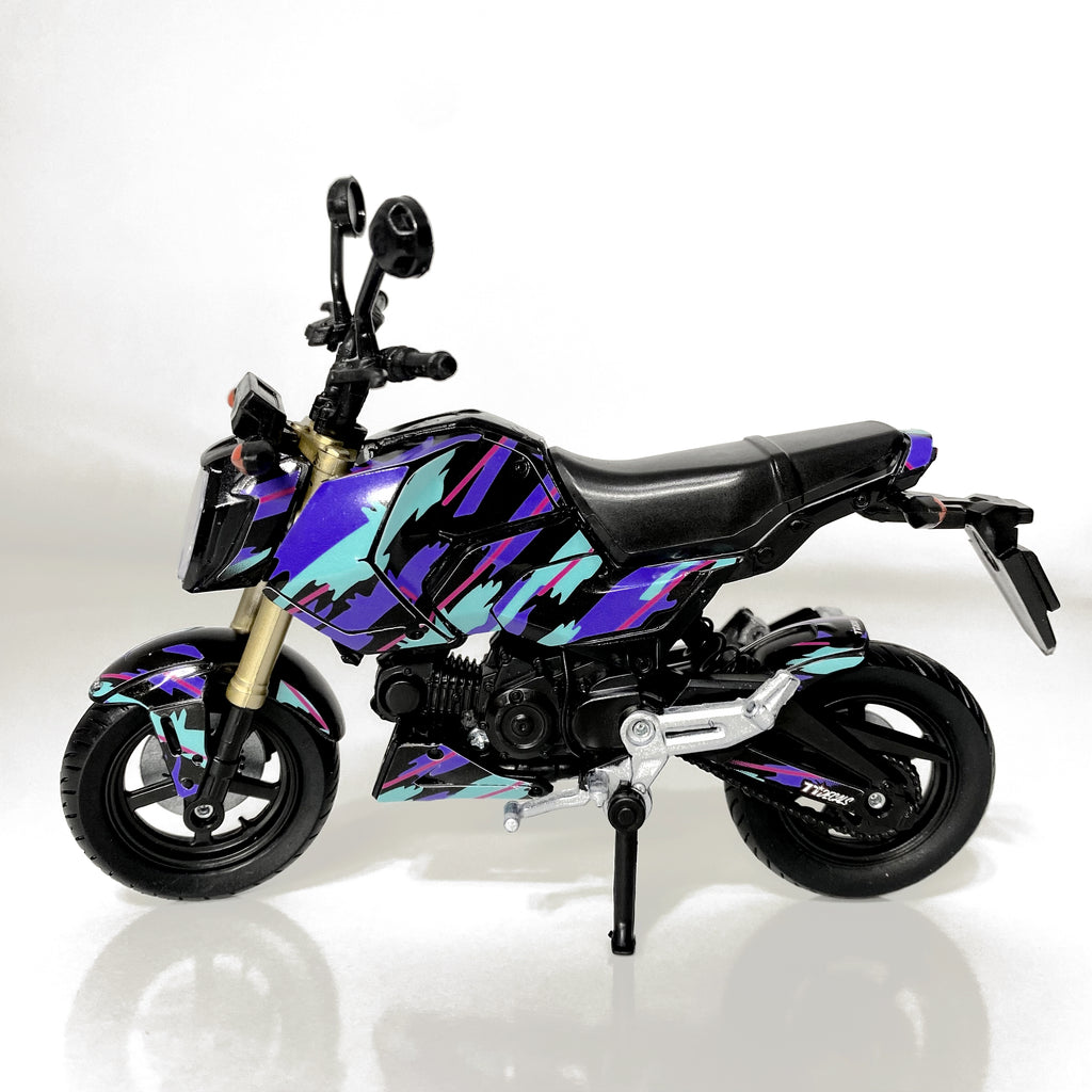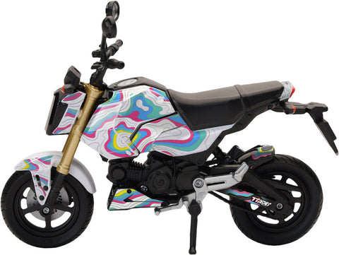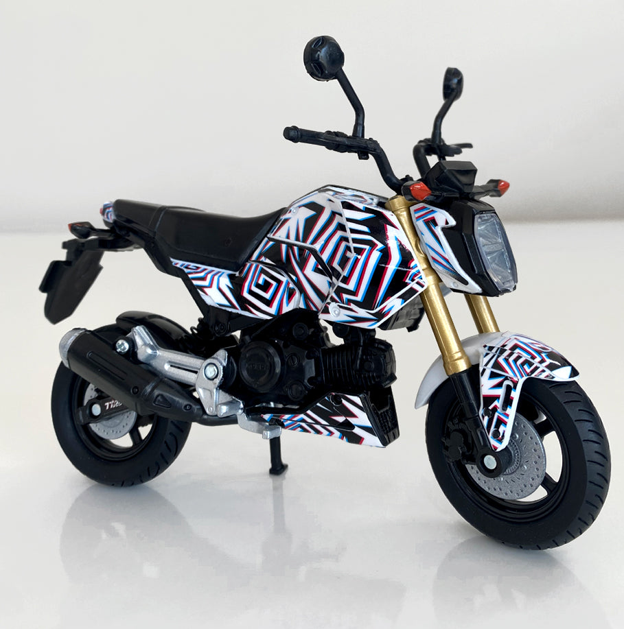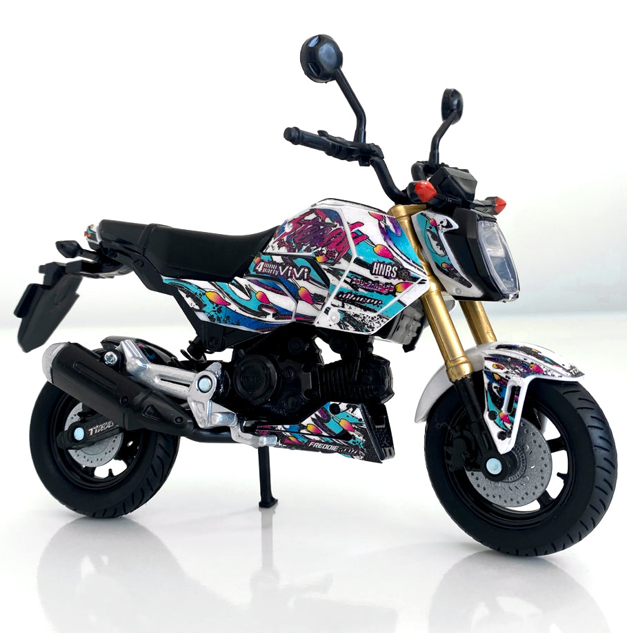 "Bring the style of your real Grom to your desk, shelf, or workshop with this detailed 1/12 Honda Grom replica, customized with your choice of a 77Decals graphics kit from our catalog. This collectible mini model is the perfect display piece for riders, builders, and anyone who reps the Grom lifestyle."